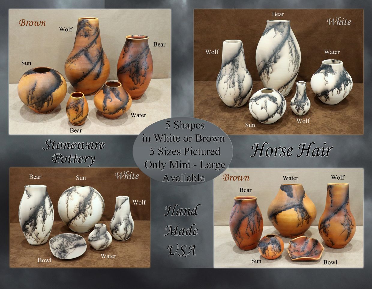 We have worked with our designer Jim making Horse Hair pottery for many years and have continued to enhance the technique over time creating a beautiful line of pottery. Horse Hair Pottery was originally created by Native Americans who used the hair from their horses mane and tail to honor and commemorate their horse through decorative pottery. Our pottery pieces are hand thrown with stoneware clay. They are then fired in a kiln and while it is still very hot the Horse Hair is delicately placed on the piece. The Horse Hair burns when it touches the pot leaving a carbon stain and smoke pattern burnt into it. Each piece will always be a unique, one of a kind piece with wandering intricate lines, and a smoke pattern look to it. The White Horse Hair pottery has a raw but smooth fired clay feel to it, while the Brown Horse Hair has a slightly smoother feel and a light brown sheen. Each piece is signed by Jim and made in Arizona USA. This pottery is for decorative use only and the coloring will always be unique to each piece. This pottery is an eye catching piece of art that displays well on any surface. More general information below.
